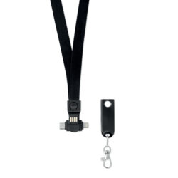 RPET lanyard with ABS safety breakaway and charging cable. USB-A and type C input to Micro-B (2 in 1 pin) and type- C output. Including metal hook.