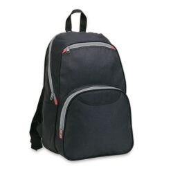 Backpack in 600D polyester with zippered outside pocket and for comfort a padded back section in 210D polyester.