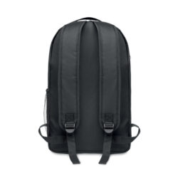 Backpack made from 600D RPET with dark restraining cords on the front and a reflective front panel feature. Bring all your belonging with you in the spacious main compartment. This backpack makes for a great daypack to bring everything you need with you to work or when you are traveling. Use the front pocket to store smaller items. Both sides of the backpack have mesh pockets where you can store drinking bottles. Easily re-adjust the straps so the bag fits comfortably on your back.
