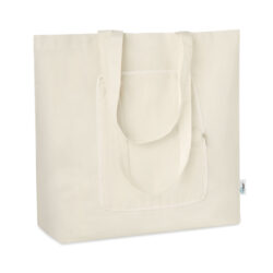 Foldable shopping bag in recycled fabrics 150 gr/m². 55% RPET and 45% cotton. The bag Includes a zipper allowing it be neatly folded. GRS certified ensuring the recycled content of this product as well as the verification of an environmentally and socially responsible production.
