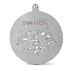 Collapsible metal coffee stencil with three designs: holly leaf, snowflake, and snowman.