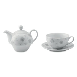 Tea set including a 400 ml teapot with a snowflake design and 260 ml ceramic cup. Presented in a carton gift box.Ceramic transfer is dishwasher safe, pad printing is not dishwasher safe.