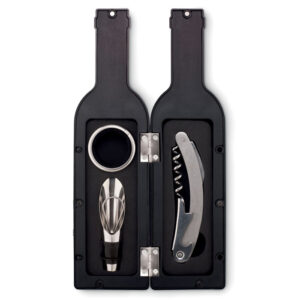 Wine set presented in bottle shaped box. With wine stopper, corkscrew and anti drip collar. Magnetic closing.