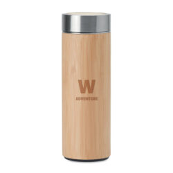 Double wall stainless steel insulating vacuum flask with bamboo cover and additional tea infuser. Capacity: 400 ml. Bamboo is a natural product, there may be slight variations in colour and size per item, which can affect the final decoration outcome.