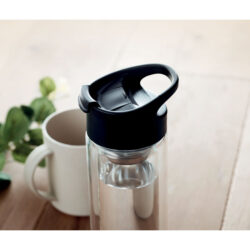 Double wall in high borosilicate glass bottle with PP lid and tea infuser. Capacity 380 ml. Leak free.