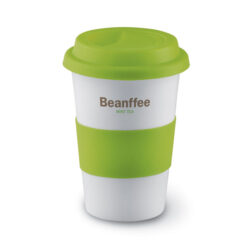 Single walled ceramic mug with silicone lid and wrap band. 400ml capacity. Not suitable for microwave use. Ceramic transfer is dishwasher safe. As this is a single walled mug heat transfer can still occur.