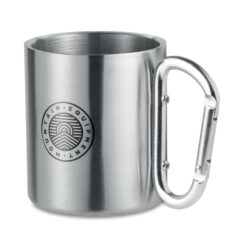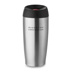 Double wall stainless steel travel cup with securable PP lid that has a push function and it is leak free. Capacity: 350 ml. Leak free.