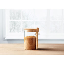 Borosilicate glass storage jar with a bamboo lid and spoon. This stylish jar can hold anything from sugar to spices and many other foods and ingredients you can use in your kitchen. With the bamboo spoon you can easily scoop out everything that is stored in the jar. The bamboo elements in combination with the glass gives this item a very natural look. Capacity: 600 ml. Bamboo is a natural product, there may be slight variations in colour and size per item, which can affect the final decoration outcome.