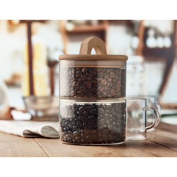 Double height storage jar made of borosilicate glass with a bamboo lid. This handy jar has two storage compartments so you can store two seperate foods or ingredients. The glass in combination with the bamboo lid gives the jar a stylish and natural look that will look great in any kitchen. Whether you want to store sugar, spices, cereal, coffee beans or any other ingredient, with a total capacity of 1 liter you have more than enough space. Bamboo is a natural product, there may be slight variations in colour and size per item, which can affect the final decoration outcome.