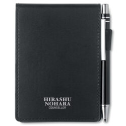 Recycled notebook with black or natural brown cover. Includes 70 pages of blank recycled paper and biodegradable recycled ball pen. Blue ink.