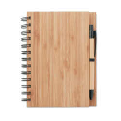 Bamboo cover notebook with 70 lined recycled paper pages. Includes matching bamboo ball pen with ABS tips and clip.