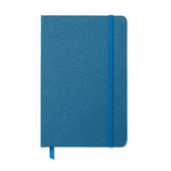A5 notebook with two tone polyester fabric cover and 96 lined pages with pocket on back cover.