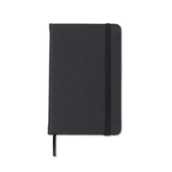 A6 Notebook with soft PU cover and 96 blank paper pages closed by an elastic band.