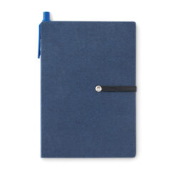 Notebook with 70 pages of blank recycled paper and ball pen with recycled carton and biodegradable plastic parts. Blue ink.