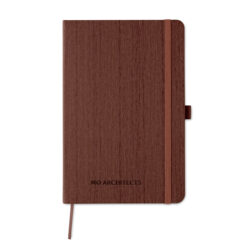 A5 notebook in wooden pattern effect soft PU cover. 80 lined pages including pen loop and closed by an elastic band.