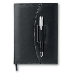 A5 size portfolio with contrasted stitching. Includes 120 page of lined paper and a metal pen. PU material. Black ink.