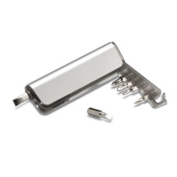 Tool set with 9 LED aluminium torch and aluminium multi tool in pen shape. Includes 3 slotted and 3 Phillips screwdriver heads. 3 AAA batteries excluded. Presented in box.