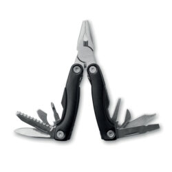 Foldable multi-tool in stainless steel with stainless steel pliers. 9 tool functions. 600D polyester pouch included.