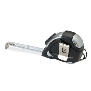 2m ABS professional measuring tape in matt silver case. Includes hand strap and shiny silver metal clip.