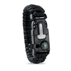 Multifunctional safety bracelet with quick release buckle, incorporating compass (decorative), whistle, fire starter with flint rod and flint scraper, useful nylon cord. Ideal for camping, fishing and outdoor trips.