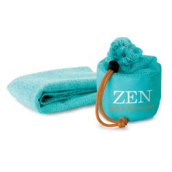 Sports towel presented in nylon pouch with adjustable closing. Towel: 70% polyester, 30% polyamide.