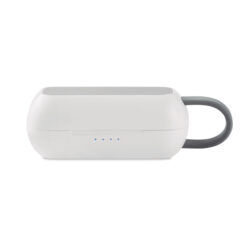 5.0 wireless earphones in ABS with built in microphone. Rechargeable Li-ion 70 mAh battery. Presented in a double sided case with carabiner. Including a charging cable with USB-A to Micro-B (2 in 1) and Type C.