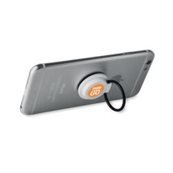 Round shaped foldable phone accessory in ABS with two functions: phone stand and holder. It has 3M sticker on the back.