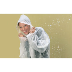 Foldable plastic poncho with attached hood, packed in a transparent polybag.