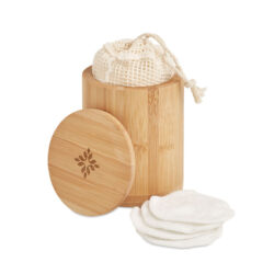 20 reusable cleansing face pads made from bamboo fibre presented in a bamboo box. This natural, cylinder shaped box will look great in the bathroom or at your vanity table. Clean your face or remove makeup with the reusable pads. Place the pads in the included cotton mesh bag for ideal washing. Bamboo is a natural product, there may be slight variations in colour and size per item, which can affect the final decoration outcome.