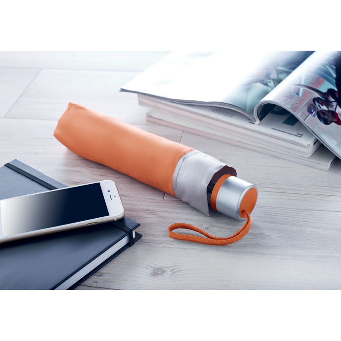 21 inch manual open umbrella in 190T polyester with zincify plating metal shaft and tips. Black plating metal ribs. Panels in colour with silver coating on back. Plastic handle in color with silver rim and black wrist strap. 3 sections fold. Includes matching pouch with silver trim. Manual closure.