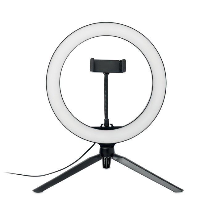 26 cm LED ring light with tripod stand and phone holder. If you are a content creator or do regular streams or broadcasts, having good lighting for you audience is an absolute must. The circular light will cast an even light pattern on your face or subject without any hard shadows. This makes the ring light ideal for Tik-tok®, live-streaming, broadcasting and Instagram photography. A wired shutter is included for the perfect selfie oppertunity. The lamp has 120 warm white LEDs with an adjustable 10 brightness levels for the perfect light exposure. Adjust the tripod stand to the preferred hight, add your smartphone to the holder and you are ready to go live.