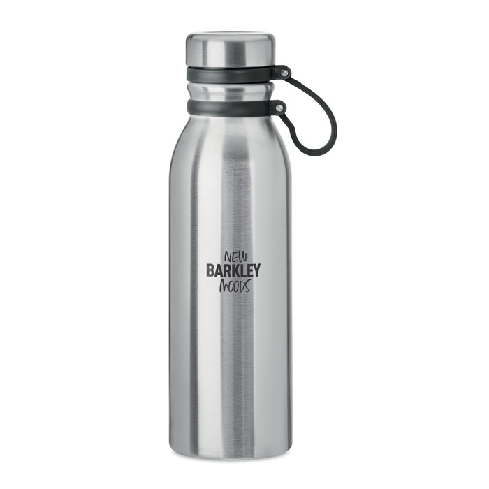 Double wall drinking bottle in stainless steel with security lock on the lid and press-to-open option. It has an easy carry foldable grip. 400 ml. Leak free. Leak free.