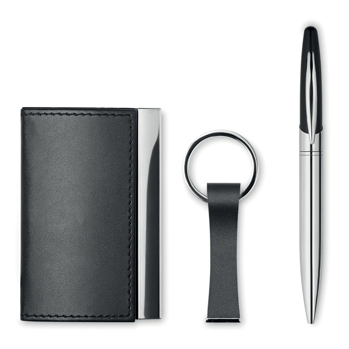 Business gift set including metal twist ball pen, zinc alloy with PU keyring and card holder. Presented in a box. Black ink.