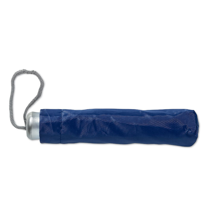 21 inch manual open umbrella in 190T polyester with zincify plating metal shaft, ribs and tips. Plastic handle in silver with grey wrist strap. 3 sections fold. Includes matching pouch. Manual closure.