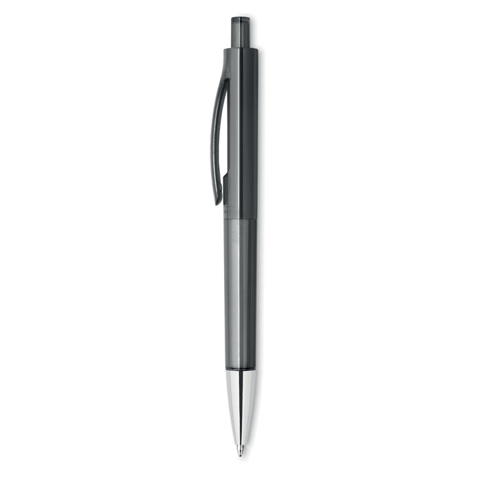 Push button ball pen in ABS with transparent barrel and shiny tip. Blue ink.