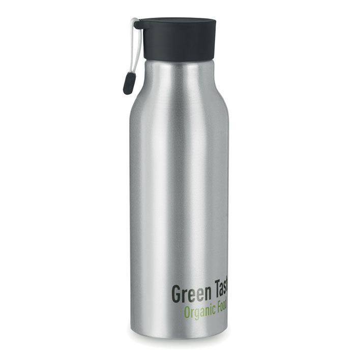 Single wall aluminium bottle with PP lid and silicone strap. Capacity: 500 ml.