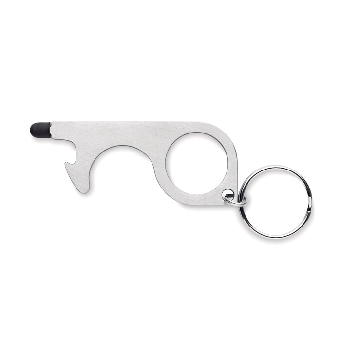 Multifunctional 5-in-1 no touch keyring. Open doors, press buttons of elevators, traffic lights, ATM`s and mobile devices without touching them. Including a bottle opener, stylus and keyring. The easy way to prevent spreading germs.