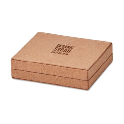 Wine set in cork laminated gift box with space for one wine bottle. Includes bottle collar, pourer, stopper, and corkscrew. Wine bottle not included. Cork is a natural material, due to its structural nature and surface porosity the final print result per item may have deviations.
