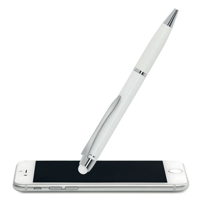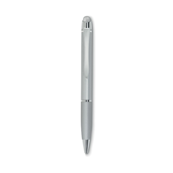 Twist action ball pen in aluminium with stylus and matching coloured body barrel and top. Blue ink.