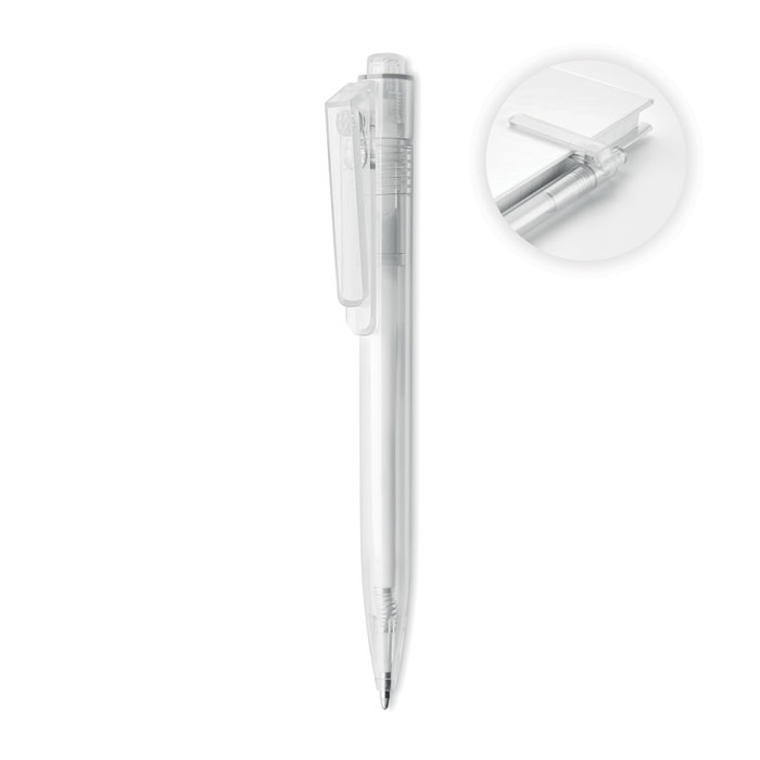 Push button ball pen in RPET with 360 degrees rotating clip function. This makes it easy to attach the pen to a notebook while having the pen on the side of it. With this recycled PET plastic pen attached to your notebook, you are less likely to forget or lose it.