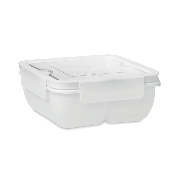 Lunch box in PP with 2 compartments and PP cutlery set. Bring a healthy homemade lunch with you to work in this PP lunch box. With two compartments you can bring two seperate foods or ingredientes without them getting mixed up. In the lid you will find a PP knife and fork so you can eat your lunch. Capacity 600 ml.