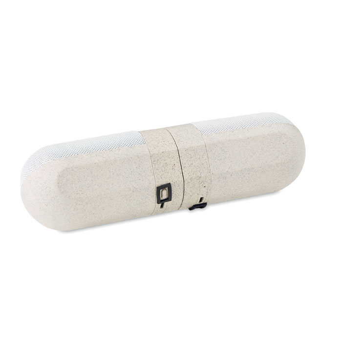 Set of 2 magnetic wireless 5.0 speakers in 30% wheat straw and 70% ABS material . TWS with auto pairing so 2 speakers can play music at the same time. 1 rechargeable Lithium 300 mAh battery included. Output data: 3W, 4 Ohm and 5V. Playing time approx. 3h.