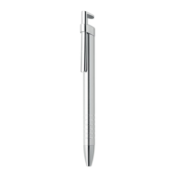 Aluminium ball pen with phone stand functionality. Blue ink.