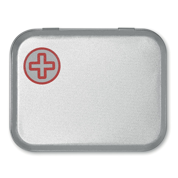 First aid kit in tin box. Includes 1 pair of scissors, 1 adhesive tape, 1 set of cleaning wipes, 3 bandages and 3 pins.